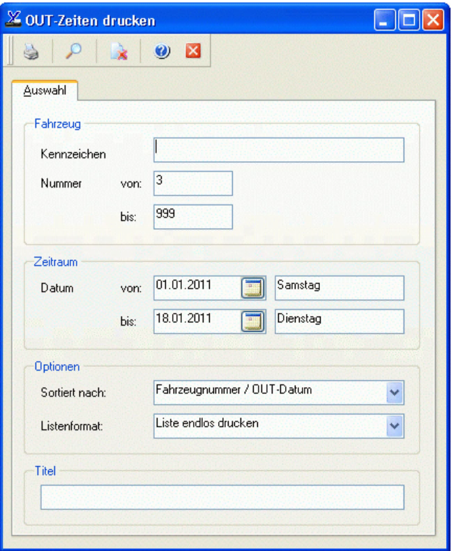 Das Fenster zum Drucken der OUT-Zeiten hat folgendes Erscheinungsbild: