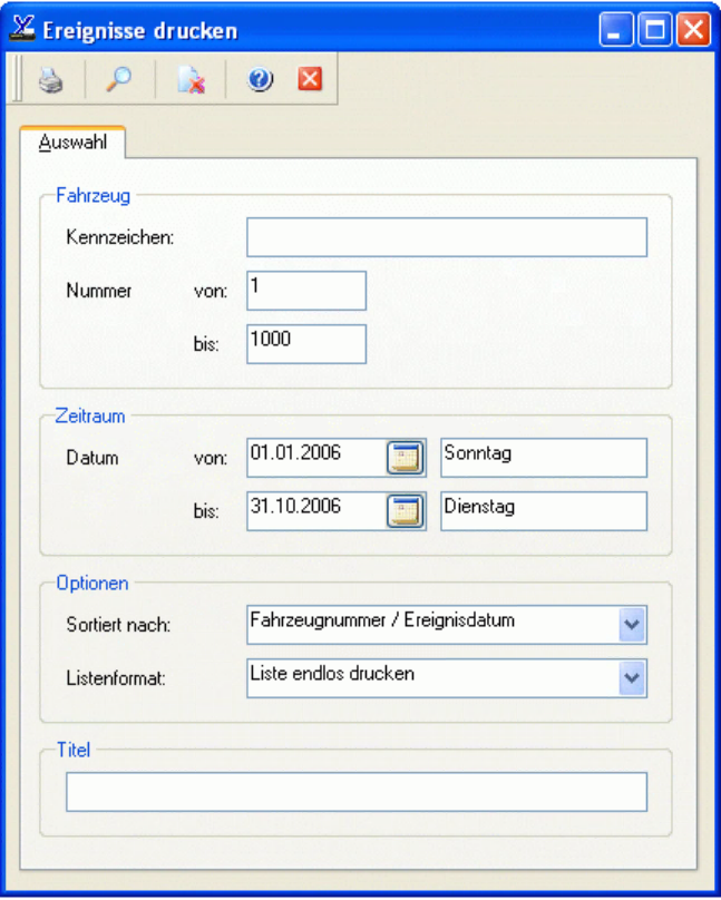 Das Fenster zum Drucken der Ereignisse hat folgendes Erscheinungsbild:
