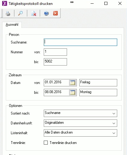 Das Fenster zum Drucken des Tätigkeitsprotokolls hat folgendes Erscheinungsbild: