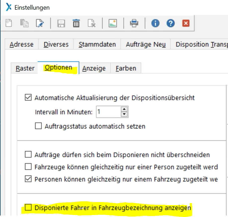 Optionen: Hier das Häkchen entfernen bei "Disponierte Fahrer in....." (siehe Bild unten)