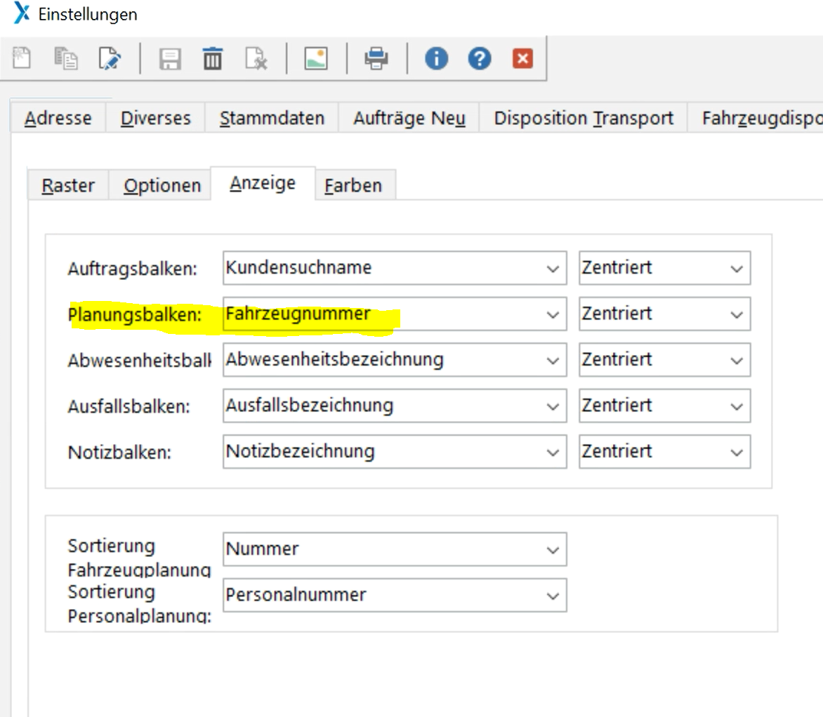 Anzeige: bei Planungsbalken muss Fahrzeugnummer ausgewählt sein (siehe Bild unten)