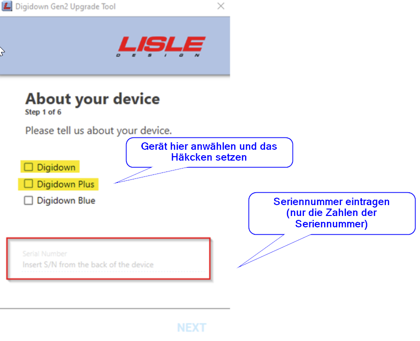 4. Gerät auswählen und die Seriennummer eintragen. Dann auf "NEXT" klicken.